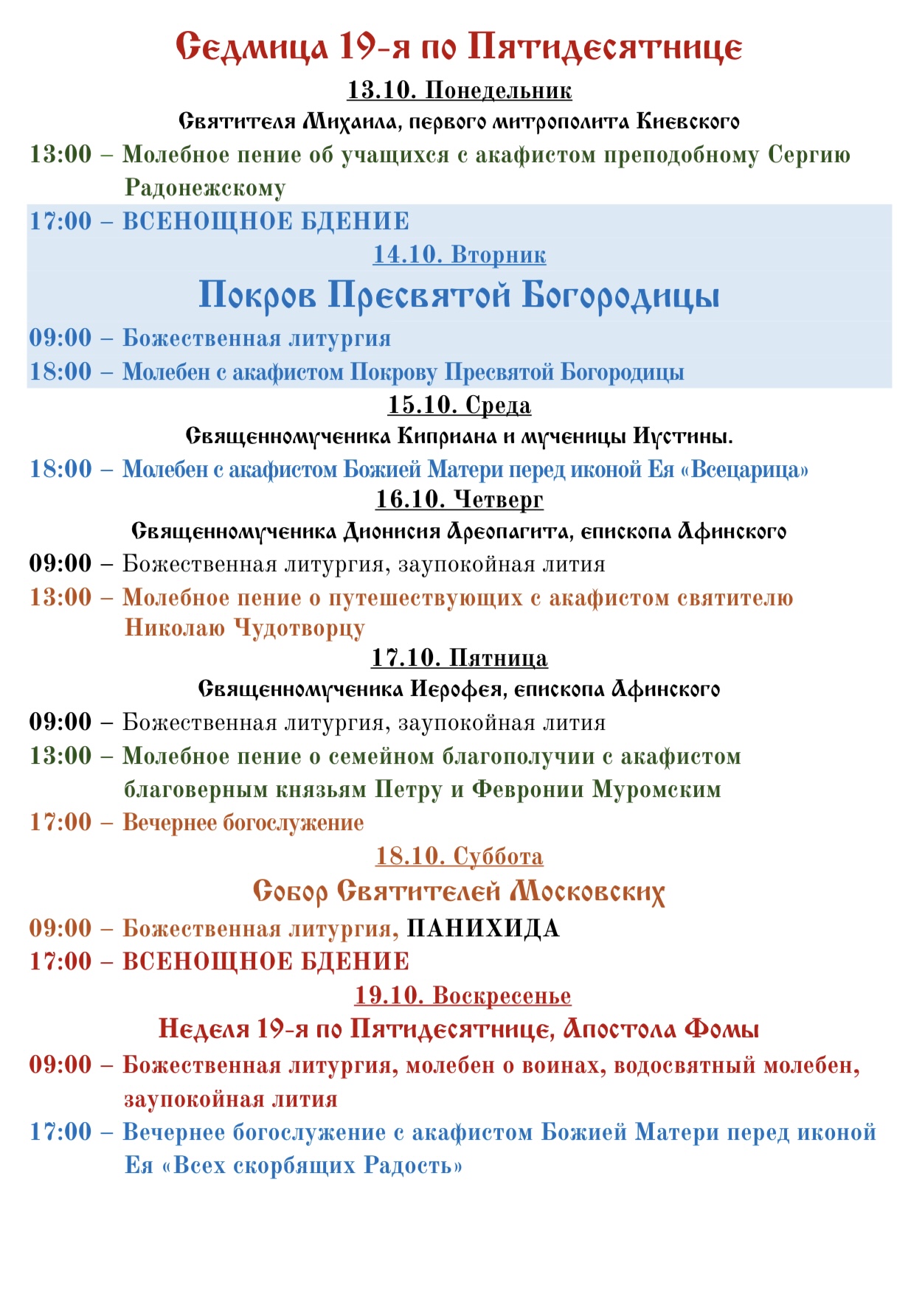 Дорогие братья и сёстры! Предлагаем вам расписание богослужений в нашем соборе на следующую неделю, с 13 по 19 октября. Божией помощи и всего самого доброго вам на предстоящей неделе!