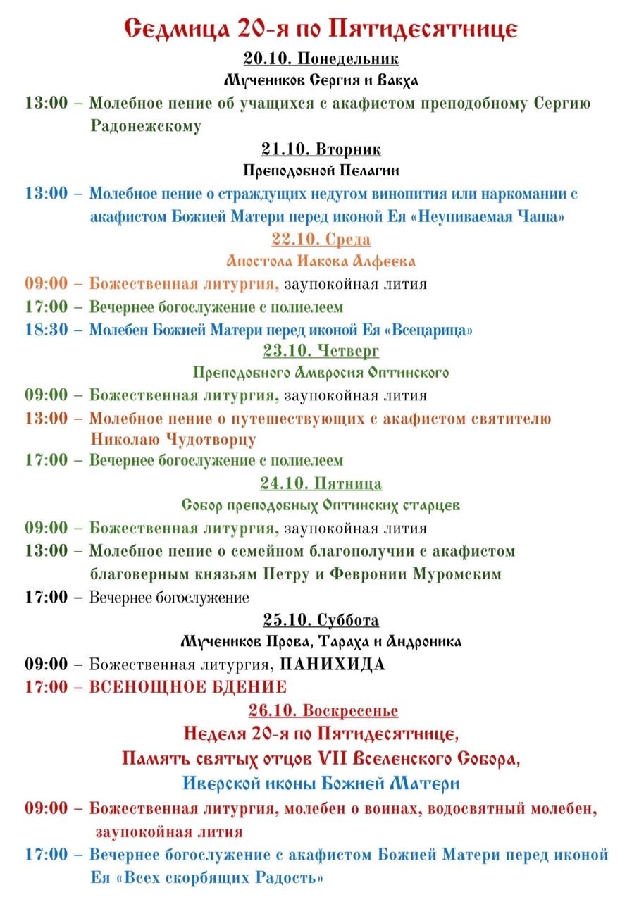 Дорогие братья и сёстры! Предлагаем вашему вниманию расписание богослужений в нашем соборе на следующую неделю, с 20 по 26 октября. Божией помощи и всего самого доброго вам на предстоящей неделе.